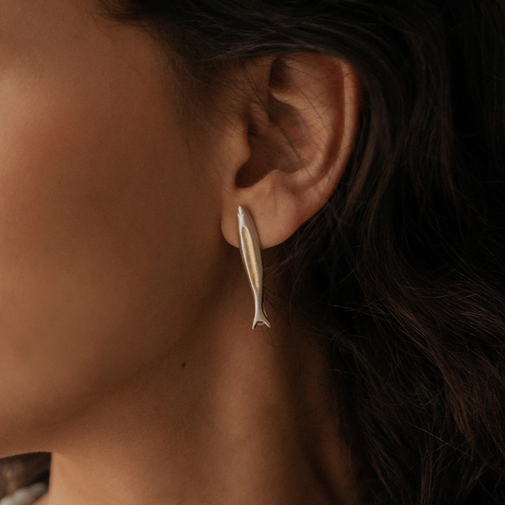 Brinco super delicado, composto por 4 peixinhos, sendo 2 deles em prata com detalhe em folha de ouro e 2 deles em latão bruto com detalhe em folha de prata.