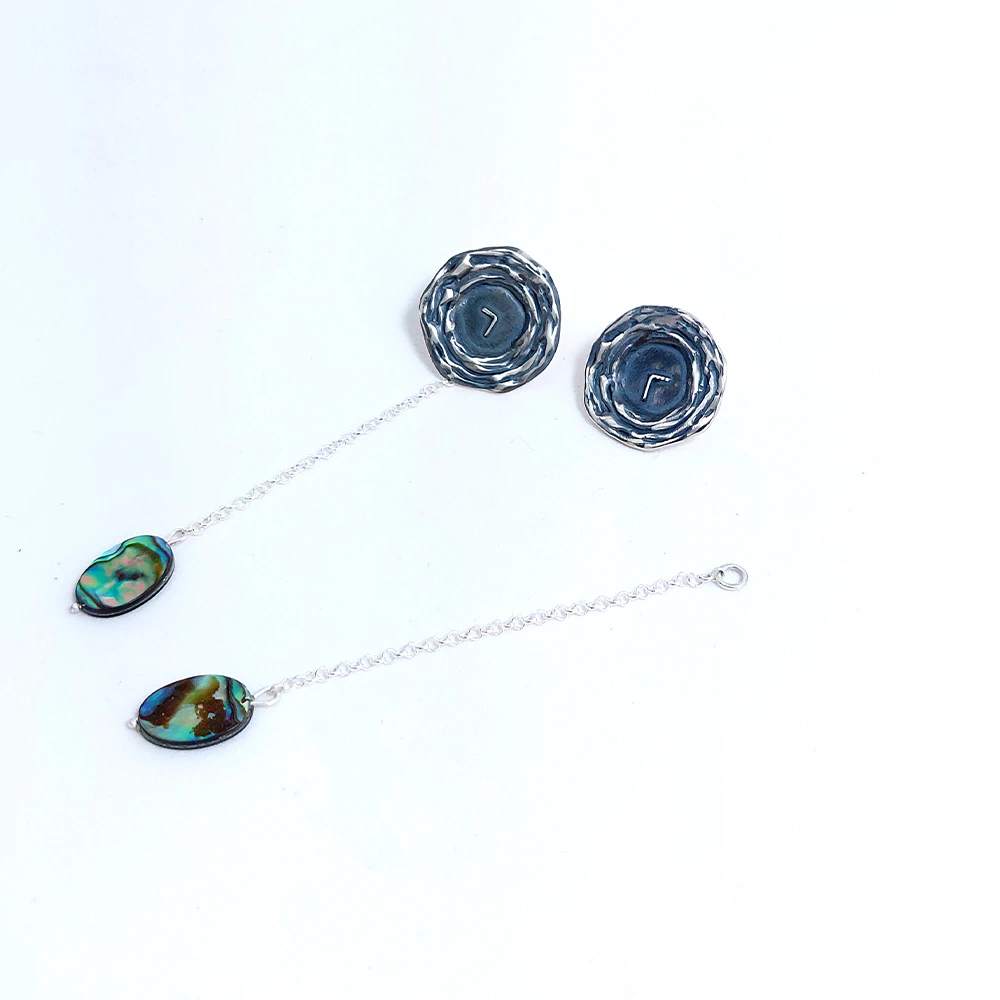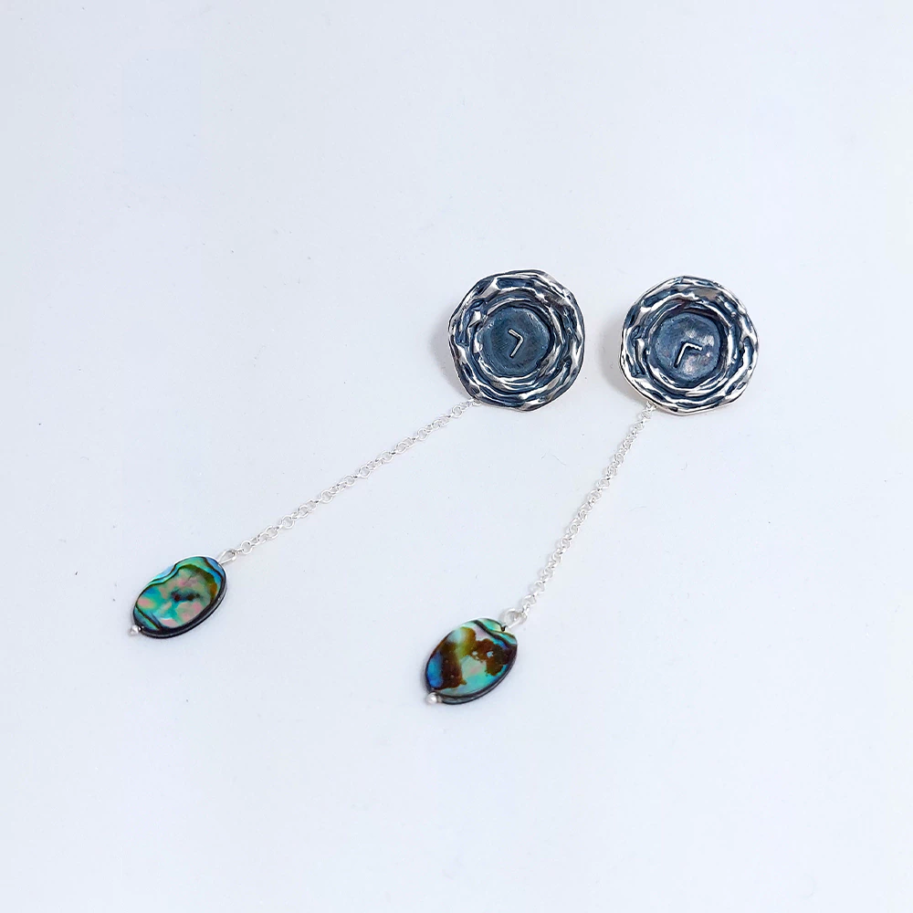 Os pingentes são correntes delicadas de prata com abalone nas pontas.