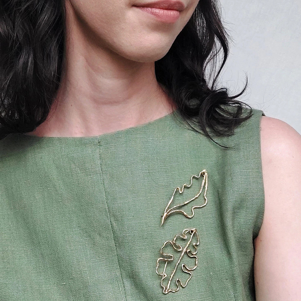 Broche em latão bruto (sem banho) com desenho de folha lobada.