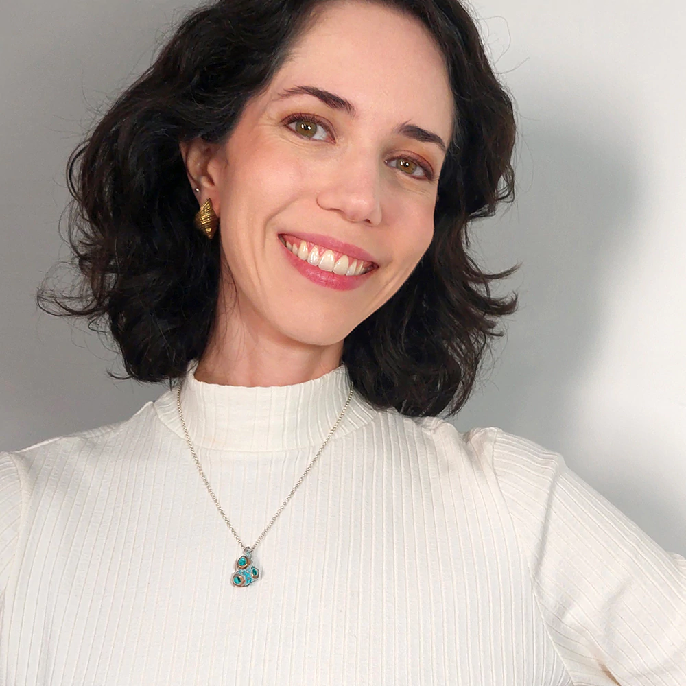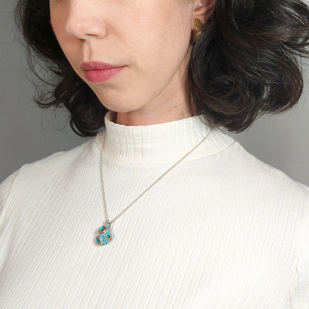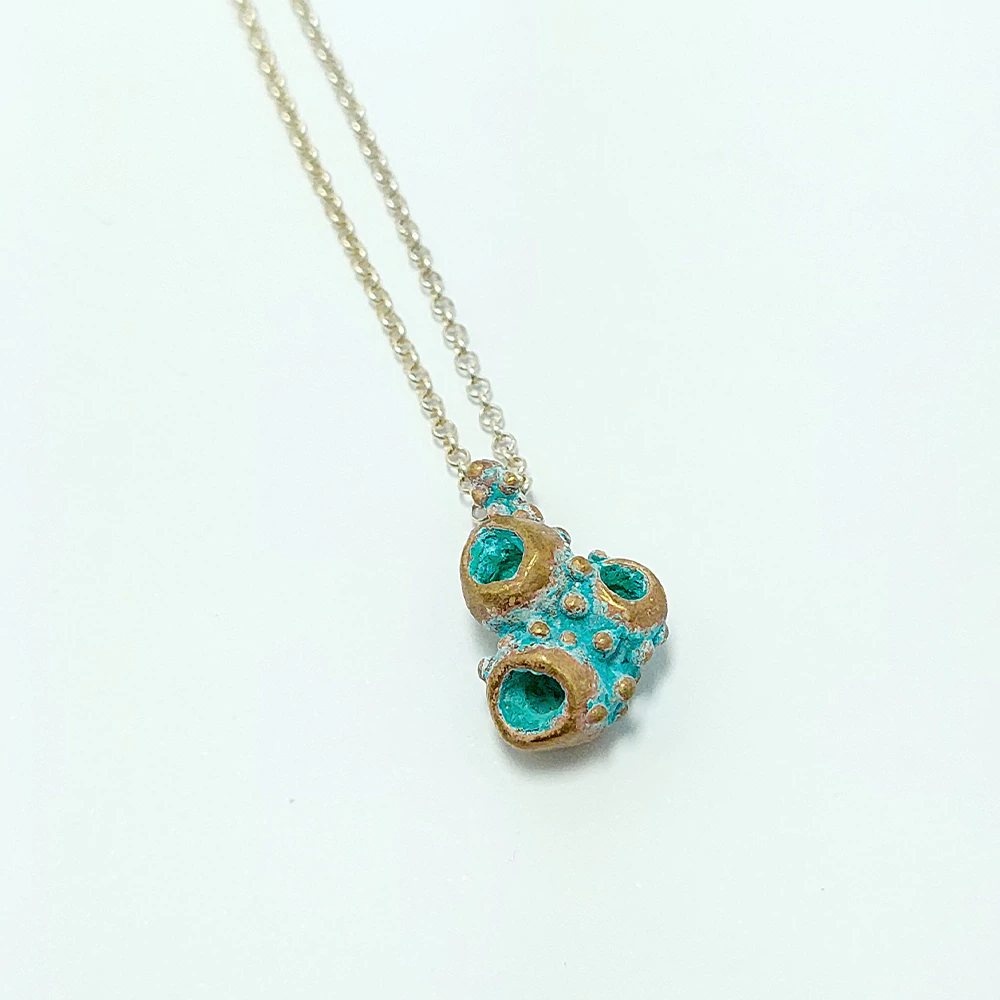Colar com pingente em latão bruto, representando corais, modelagem irregular, totalmente à mão, cor verde-azulada feita com pátina reagente.
