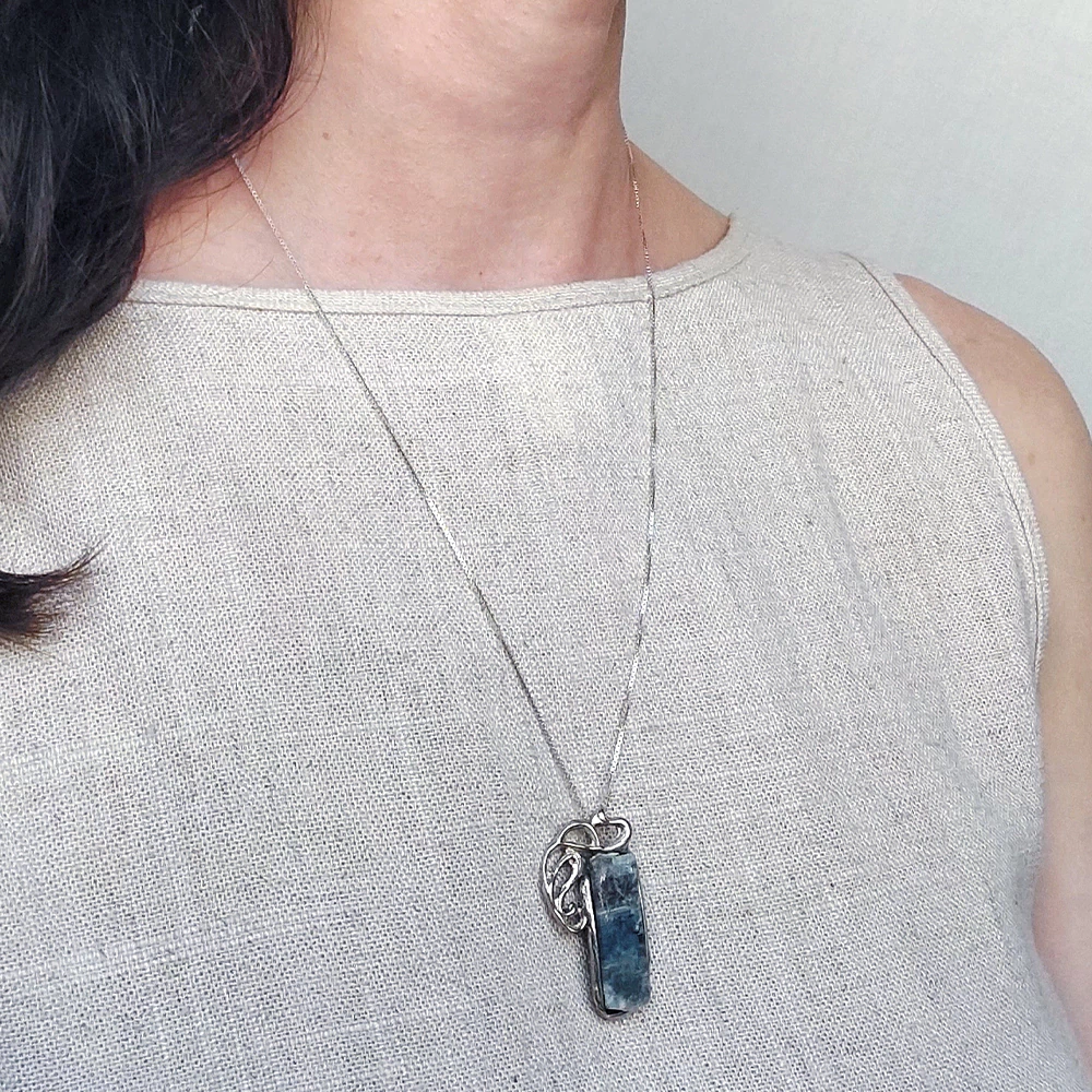 Pingente em prata com pedra natural cianita, tamanho aproximado de 4 cm x 2 cm.